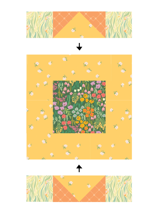 Next sew a 2” x 6 1/2” strip from Fabric F to the top and bottom to frame your square.
