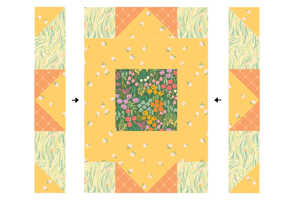 Sew these rows to the top and bottom of your framed square block making sure the flying geese are pointing away from the center.