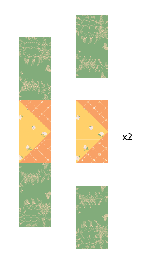 Sew a 2” x 3 1/2” strip from Fabric F to each side of a 3 1/2” square from Fabric C.