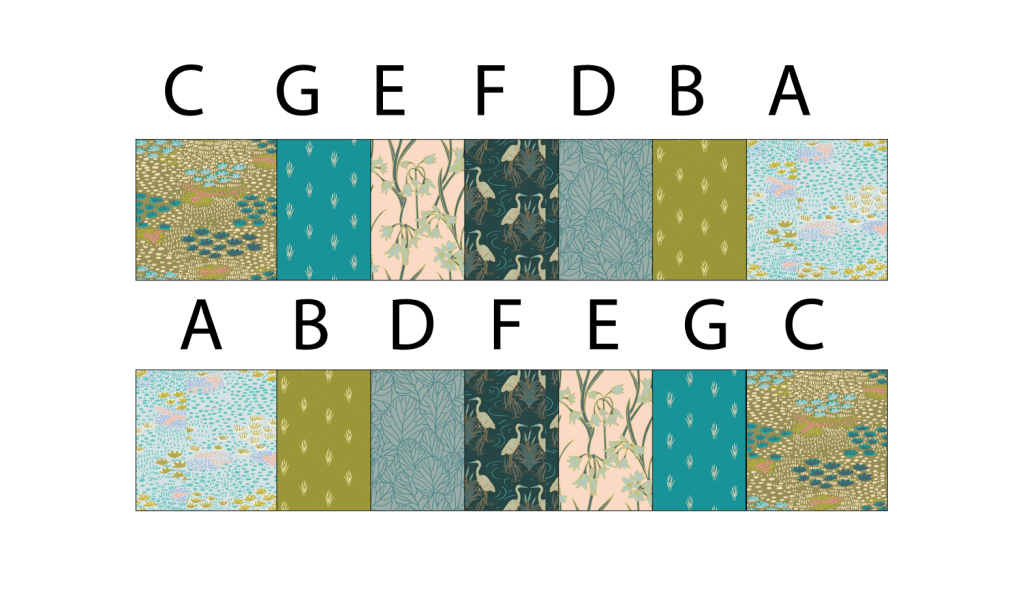 Sew a 3 1/2” Fabric A square to a 3 1/2” x 2 1/2” rectangle from Fabric B,D,F,E,and G and to the end sew a 3 1/2” Fabric C square.