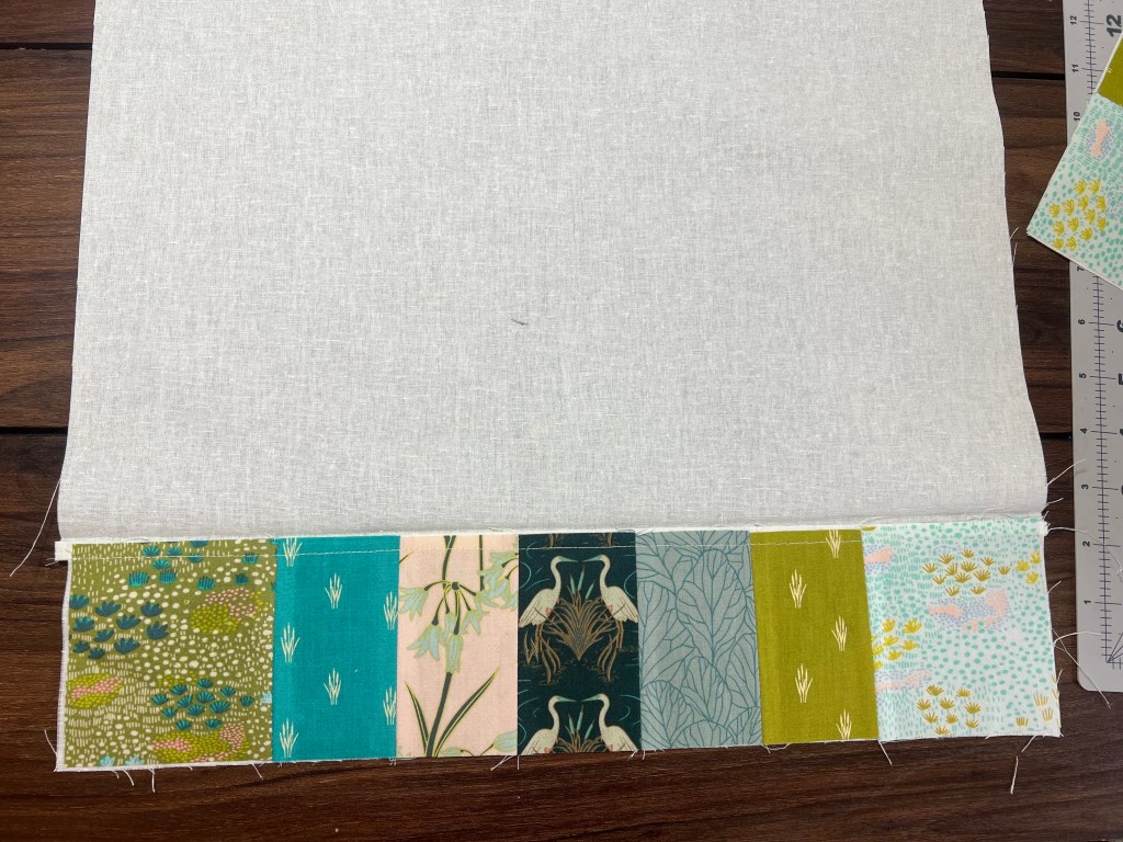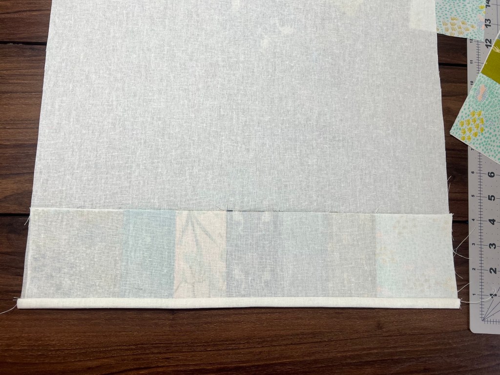 Sew strips to the top and bottom of your patchwork strip sets at 1/4” . Place fusible tape on the back side of the strips and measure 5 1/2” up from the bottom and top of your 16 1/2” x 32 1/2” rectangle from Fabric D. Attach patchwork and press into place. Topstitch down trim as close to the edge on each side as possible.